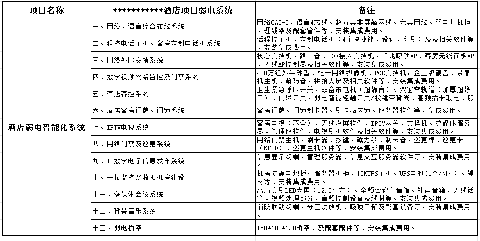 本设计中弱电系统主要有:1、网络、语言综合布线系统:2、程控电话主机、客房定制电话机系统:3、网络外网交换系统:4、数字视频网络监控及门禁系统:5、酒店客控系统:6、酒店客房门牌、门锁系统:7、IPTV电视系统:8、网络门禁及巡更系统:9、IP数字电子信息发布系统:10、监控、数据机房建设:11、多媒体会议系统:12、背景音乐系统:13、弱电桥架。