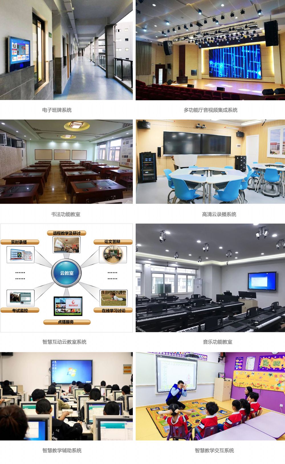 智慧教学交互系统;智慧教学辅助系统;智慧互动云教室系统;高清云录播系统;音乐、书法、舞蹈及美术功能教室系统;电子班牌系统;多功能厅音视频系统。