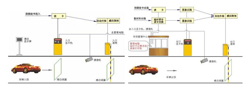 1)入口部分:直杆道闸、数字式车辆感应器、远距离读卡器、韦根转换器、入口控制器、双基色LED显示屏、出卡机、有源语言音箱、固定摄像机、岗亭。