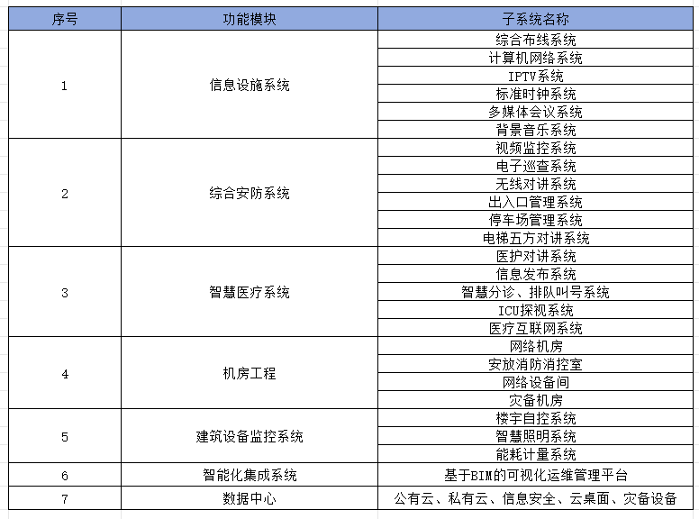 主要包含7个功能模块:1、信息设施(基础)系统;2、综合安防系统;3、智慧医疗系统;4、机房工程;5、建筑设备监控系统;6、智能化集成系统;7、数据中心设备。